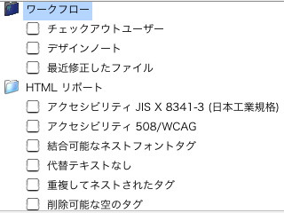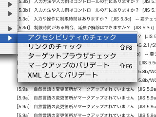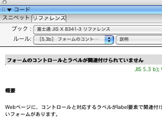 チェックメニューに「アクセシビリティのチェック」が追加され、リファレンスにも「富士通JIS X 8341-3リファレンス」が追加されてました。早速簡単なファイルをチェックしてみたのですが、Dreamweaverでチェックするのは限界がある気がします。便利な面もあるのですが、?マークが付いた警告が沢山出て一々面倒です。×印が付いたモノだけ重点的に気にすれば良い気もしますが、警告が無くならないのは非常にスッキリしないです。自分なりのガイドラインを作れば良いのだろうけど・・・。