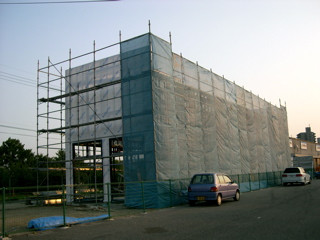 それから、城南中学校からするとせせらぎ公園を挟んだ斜向かいになにやら新しい建物が工事中です。入り口の形からしてコンビニでは無さそうなのですが、1階はガラス張りっぽいです。それから入り口が通りに面しているのではなく、せせらぎ公園側を向いてます。建築主などの表示が見つからなかったので、何を作っているのかは分かりませんでした。丁度入り口の上の辺りが看板が入る位置なのか特徴的な形をしています。雰囲気からするとメガネ屋かな。100円ショップというケースも考えられますが、だとしたら看板の形が違うような気もします。