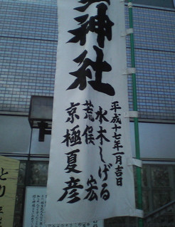 以前から気になっていたし、荒俣宏、京極夏彦、水木しげるの三名の名前が入った幟があるという事を聞いていたので、実物を見てみたくて行ったわけなのですが、何故か不思議な名前の入った幟を発見。神社の入り口に二つの大きな幟があり、左はその三名の名前が入ったモノがありました。で右を見ると・・・。衣笠?・・・衣笠祥雄と有るじゃないですか。多分、元カープの野球選手だった衣笠ですね。同姓同名って事はないだろうから。間違いないでしょ。でも何故?気になります。