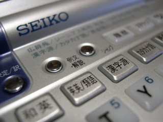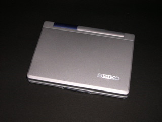 以前から電子辞書は欲しいと思っていたのですが、決め手となる機種がなかなか見つからず、買えずにいました。機能と価格で妥協してSHARP Papyrus PW-M800を買おうと思ったりもしたのですが、迷っている内にアマゾンで売っていた10500円のPW-M800は売り切れてしまいました。その後、他の機種を物色していたのですが、色々と調べれば調べるほどに英英辞書は欠かせない気がしてきて、更にその線で機種をピックアップしたら、コンパクトサイズで英英辞書を搭載した機種が少ない事が分かり、悩みました。結局、店頭で売っているモノを触ってみて、決めようと思って昨日、八木のデオデオへ行き、偶々特別価格になっていたSIIのSR-M4000を見付けました。今まであまり眼中になかったのですが、調べてみたら悪くなさそう。すぐには買うのは失敗しそうな気がしたので、カタログを貰って帰りました。その後、他の候補と比較しながら検討した結果、値段的にも機能的にも妥当だと判断し、本日買ってきました。税込み、14800円。他にも安い所はありましたが、デオデオで買えば5年保証なので、デオデオで購入しました。