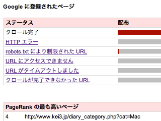 「検索クエリの情報」が見られたり、「PageRank の最も高いページ」と言うのも見られるようになりました。PageRankに関しては4なんて比較的高いランクが付いているページがある事になってます。しかし、ページの構成なんかを変えてしまったので、ツールバーでは確認出来ず。(^_^;)