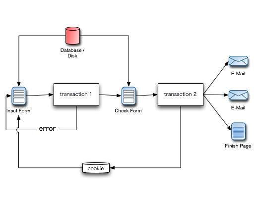 で、考えた方法が、入力フォームと確認画面のフォームボタンを用意し、それぞれに対応したカスタムトランザクションを用意。これはデータベースを使わず、メール送信などのトリガーを使う為にカスタムトランザクションを使います。