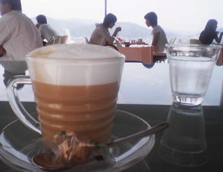 着席して、飲み物だけ注文し、暫くすると雷鳴と共に豪雨。見晴らしが良かったのに僅かな時間で視界がどんどん悪くなり、眼下の街並みが真っ白。驚きました。まるで熱帯のスコールの如く激しく降った後は、眩しいまでの日差しが背中を照らし、目の前の大きな窓枠の向こうに、見事なまでの虹が出てました。ココまで見事な虹は久々です。残念ながらデジカメを持参してなかったので悔やまれます。(T_T) どんなに綺麗に虹が出ていてもデジカメで撮るとその感動まで写し取ることは難しいのですが・・・。