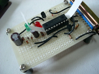 回路図から配置を考えて、仮組み自体は先週済ませていたのですが、本格的に組み立てたのは昨日からです。第一号機は動作確認が出来るように電源とアクセス確認のLEDを付けて作りました。慎重に配置や配線を確認して、半田不良など無いかとデジカメで撮影した後にパソコンで拡大して確認しました。問題無さそうだったので、PICを載せてパソコンに接続。ウェブ上にあったHEXファイルをIC-Progで書き込み。しかし、エラーが出ます。試しにWinPicでも確認しましたが、これもダメ。この状況がパソコンのポートから供給されている信号が弱いからなのか、自分の作ったモノがミスをしているのか分からないので、一号機は置いておき。今度はブレッドボードで作ってみました。