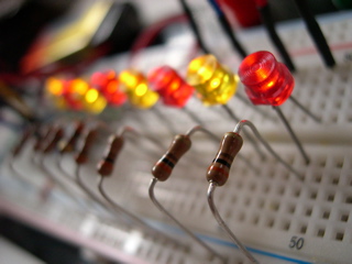 この二点を改善した結果見事にLEDが点滅してくれました。丁度二色のLEDを使っていたので、交互に配置すると赤色、黄色と交互に点滅します。素晴らしい!!(笑) 初めてパソコンを自力で組み上げて起動したときのような感動を覚えました。
