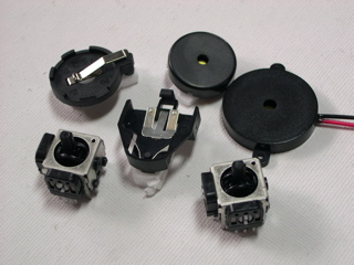 圧電サウンダはPICから音を出す場合なんかに使ってみようかなと思って買いました。普通のスピーカーでも良いのですが、嵩張るので、実験はこれでやってみます。それからアナログジョイスティックはPIC16F88にアナログ入力して、何らかの形で出力できれば面白いかなと思って買ってみました。思っていたよりも小さく、手を離すと中心に戻るタイプだったので、思っていたモノとは少し違っていたのですが、MIDIでベンダー情報を出力するなどの場合には丁度良いのかも。