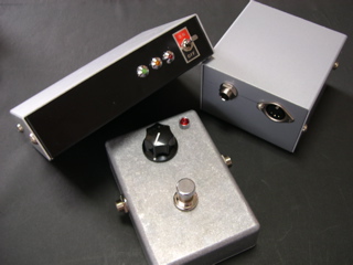 中央のアルミダイキャストは当初MIDI-CV/GATE変換器に成る予定だったのですが、上面にDINコネクタを付けるにしても奥行き的に問題があり、横に付ける場合、強度的に問題がありそうだったので、やめました。結局、以前購入していたフットスイッチを取り付けて、ギターエフェクター風にしました。中身はどうするか未定です。(^_^;)