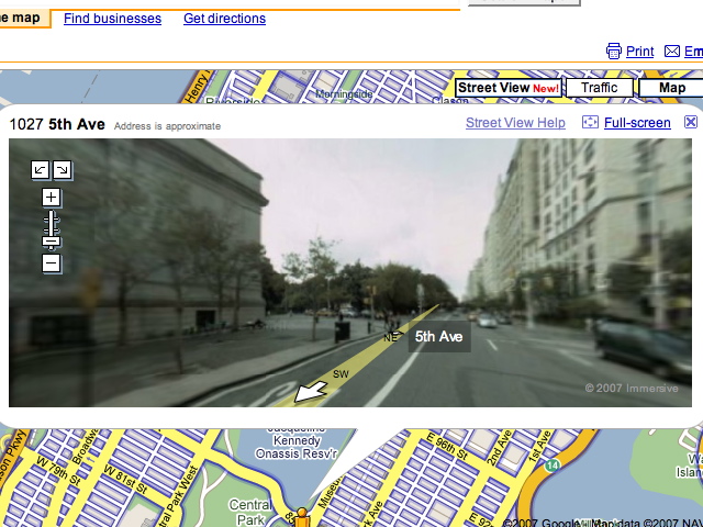 Googleが地図検索ページに新たな機能を追加したようです。今度の新しい機能は「Street View」です。その名の通り、道路沿いの景色を見ることが出来ます。一部の地域しか対応してないようなのですが、指定したポイントの周りを見回すことが出来たり、道路に沿った形で移動できたり面白いです。
