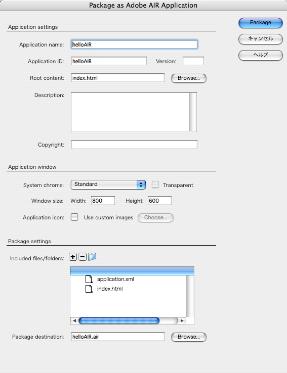 エラーを無視して試しにAIR用にディレクトリーを作成し、Dreamweaverでプロジェクトを定義。取り敢えずindex.htmlでファイルを作成。日本語を表示する場合UTF以外では文字化けするらしいので、UTFにキャラセットを変更。適当にHTMLに文字を書いて保存。パッケージ化のメニューを選択して、各種設定のダイアログでindex.htmlをRoot Contentに指定し、その他必要なところが有れば設定。後はPackageボタンをクリック。で、出来上がり。.airファイルが出来ているので、それを利用してインストールすれば、AIRアプリケーションがインストールされます。