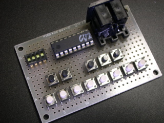 兎に角小さいMIDIキーボードが欲しいと某所に書いている人が居たので、だったらタクトスイッチで作れば安価で結構小さくなるのでは?なんて思ってユニバーサル基板にタクトスイッチなどを載せて、どの程度の大きさになるのか試してみました。写真の右上は5ピンのDIN端子です。ここにMIDIケーブルを繋ぎます。これを見れば大体の大きさは想像つきますよね。