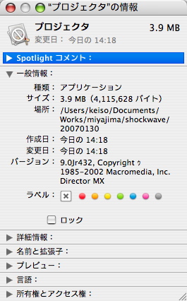 それから、Macromedia Director MXで書き出したプロジェクターがIntel Macではアイコンに具合悪そうなマークが付いてます。一応起動するのですが・・・。