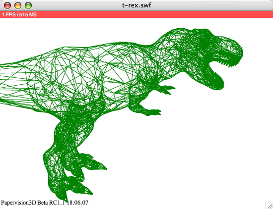 先日Papervision3Dを使って作ったティラノザウルスを試しにワイヤーフレームのマテリアルに変更してみました。と言うのもColorMaterialだとシルエット状態になってしまい3Dぽっさが無いので、WireframeMaterialに変更してみたのですが、更に動作が遅く、重い感じになります。(T_T)