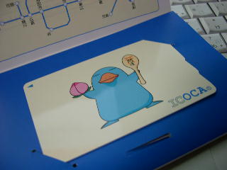 広島でも始まったICOCAの記念カードを買いました。岡山と広島でのサービス開始記念なので、妙なキャラクターが右手に桃、左手にしゃもじを持ってます。中央のキャラクターはカモノハシのイコちゃんというらしい。