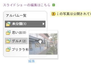 「フォト」の部分では画像のドラッグアンドドロップで写真の分類が出来ます。ソースを見るとmootools.jpを使っているようです。サーバーとの通信はXMLではなくJSON。最近、Ajaxな挙動をしていても通信部分はXMLではなくJSONが増えているのかもしれません。サーバーのレスポンスは悪くないのですが、ファイルのアップロードで複数のファイルを指定した場合に、エラーが出たりしたので、処理が上手く行ってない部分があるようですが、比較的システムとしては良くできているようです。