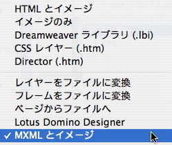 書き出しの種類選択の一番下に「MXMLとイメージ」という項目が有るので、それを選択して書き出しを行うだけ。簡単です。