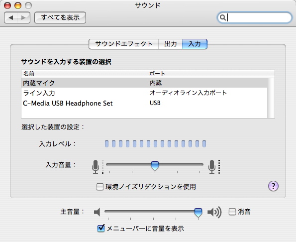 入力は問題無さそうなのですが、ヘッドセットでミュートにしてもレベルゲージが高い状態になったままです。直流が流れている所為かもしれません。以前、このヘッドセットで録音したときに直流が流れていて、録音データを編集するときにちょっと気持ち悪かったです。