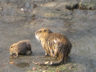 八木のトイザらス裏に居着いているヌートリアがいつの間にか一匹増えていました。以前は親と子供二匹の合計四匹だったのですが、小さい奴が一匹増えていました。居着いてから随分経つので環境に慣れたのか、警戒心がかなり薄くなっているようです。以前は人影でもビクビクしていたのに、今日は3m位まで近づいても逃げません。お陰でかなり近づいて写真が撮れました。以前使っていたデジカメとは違い光学ズームが付いているので、アップの写真が撮れました。しかし、ズームを使うと手ぶれが如実に表れるので、写りとしてはイマイチ。次回は三脚を使って撮りたいです。レリーズも有った方がよいかも。でも安くないんだよね。インターバル撮影出来たりと多機能なレリーズの様なので、1万円位します。魚眼レンズと雲台も買うとなると結構な額になりますね。