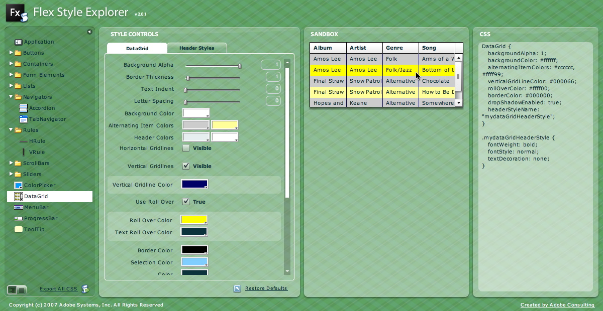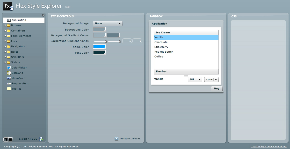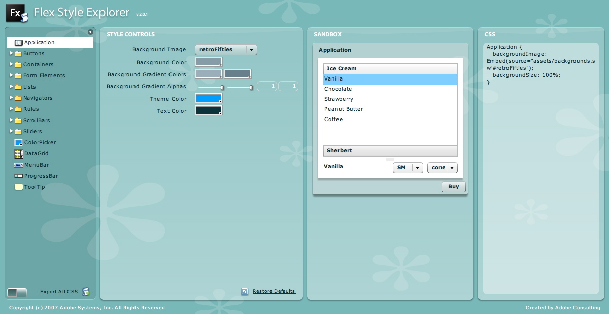 Flex用のスタイルシートを生成する「Style Explorer」がFlexデベロッパーセンターで紹介されてました。色味や見た目を変更したい場合に便利かも。