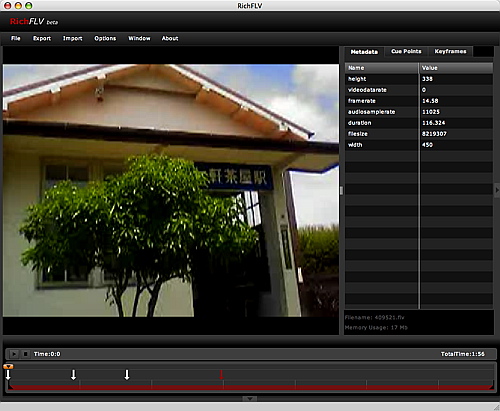 キューポイントを追加したり、XMLで入出力できるなど非常に便利です。世間一般的にはFLVから音声だけを抜き出してMP3形式で書き出す様な事に使われているようですが、個人的にはキューポイントの編集が一番の魅力の気がします。
