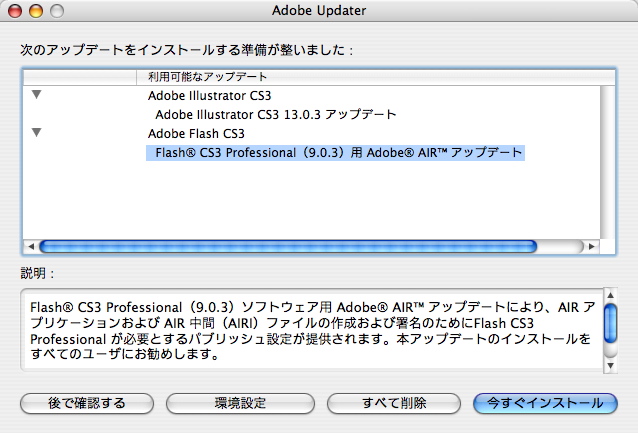 Flash CS3でAIR 1.0でパブリッシュ設定を行ってカメラ関連のテストを行おうと思ったら、以前書いたソースのままでは画面に出ません。どうやらcameraクラスのイベント(StatusEvent.STATUS)が発生してない雰囲気。