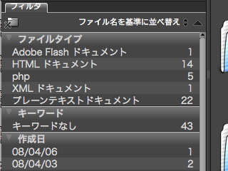 効果的な使い方が思いつかないのですが、Bridgeでは幾つかのフィルターをかけてファイルを表示できるので、修正日が今日のモノなどを簡単に表示できて、便利と言えば便利です。ラベルなども設定できるので、活用すれば便利なのかも。しかし、Dreamweaver CS3から開くメリットはイマイチですが。(^_^;)