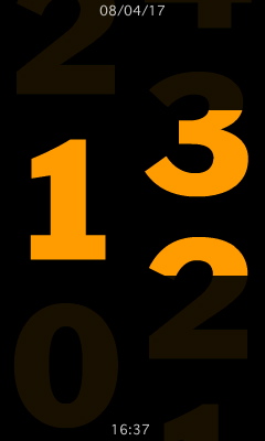 秒を大きく表示しただけです。上から文字がスクロールして置き換わります。それだけ。日時も一応上下に入れていますが、可成り小さくしたので、見辛いです。携帯電話自体の時計が表示されているから、潔く削っても良かったんだけど、デバッグがし辛いので一応入れました。