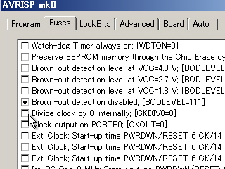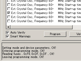 最初に上手く行かなかった原因は、AVR Studioの使い方をよく分かってないので、もしかするとフューズビットの書き込みが出来てなかったのかも。