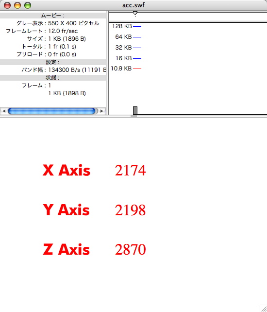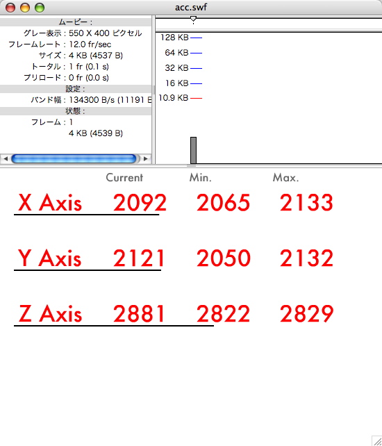 Interface 2008年9月号の付録「ColdFire基板」の加速度センサーの値をFlashで表示してみました。