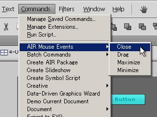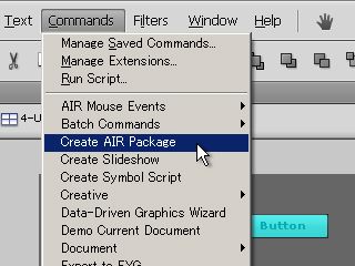 次に、AIR。コマンドメニューに「Create AIR Package」や「AIR Mouse Events」というコマンドが追加されていて、若干のマウスイベントを追加してAIRアプリが作れるようです。書き出しのメニューを見る限り、HTMLベースのようです。しかし、残念ながら上手くパッケージの書き出しも出来ず、プレビューも出来ないので、試す事が出来ませんでした。
