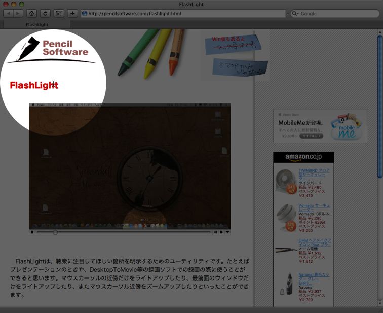プレゼン繋がりで序でに書くと、マウスカーソル付近だけを明るく表示するツールを発見しました。以前誰かが使っているところを見たのですが、何なのか聞く事が出来ず、分からないままになってました。FlashLightだったんですね。シェアウェアなので、登録しないと機能制限が掛かってます。