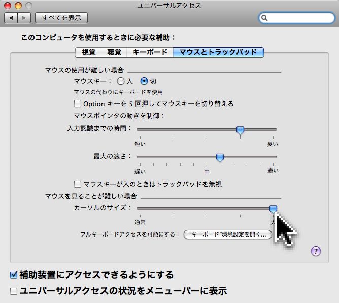 マウスカーソルの拡大機能はいつの間にかOSの標準機能になっていたんですね。「システム環境設定」の「ユニバーサルアクセス」で設定が出来ます。