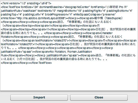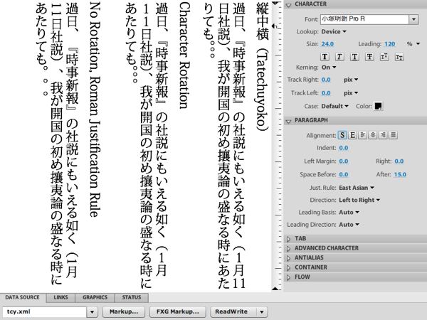 Flash Text Layout Frameworkベータ版が公開された様です。Adobe LabsのText Layout Editor Demo Applicationに日本語の縦書きサンプルもあります。