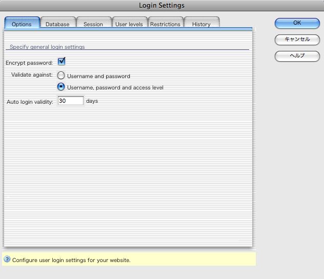 データベースに格納するパスワードは暗号化した方がよいので、「Encrypt Password」にチェックを入れておきます。「Validate againist」は、アクセスレベルを今回は使うので、「User name,password and access level」を選択します。ログイン機能を使うユーザーが一人だったり、権限の違いがない場合は、「User name and password」を選んで下さい。