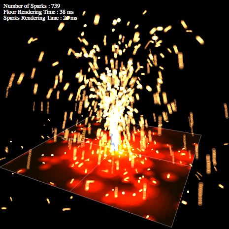 床に火花が跳ね返っていたり、光が床に反映していたり素晴らしいです。3Dな空間に飛び散るパーティクルが綺麗。