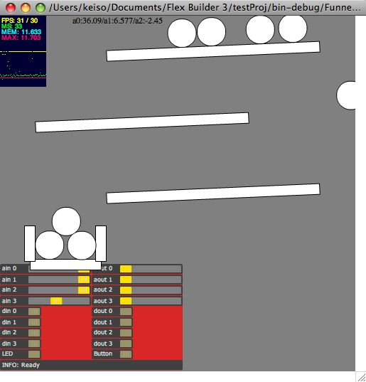 どうやらFunnelのanalogInputにはaddFilterとか、filtersなんてモノがあるので、入力値の変化をなめらかにして取得したり出来るっぽい。そのまま値を使うとノイズが乗って使い物にならないので、Tweenerを使って、処理していたのだが、その部分は、もしかするとFunnelの場合は不要かも。