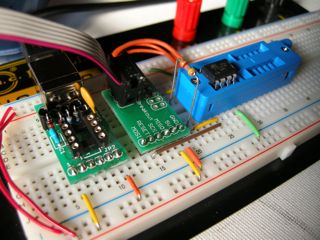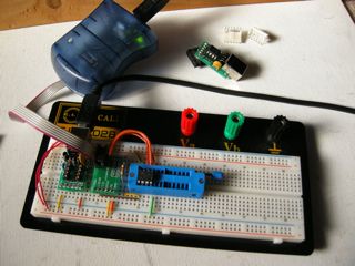 Pepperの回路のまま繋いで書き込み可能なのかよく分からなかったので、ゼロプレッシャーソケットとブレッドボード、4.7kの抵抗で簡易ライターを作り書き込みました。電源供給はマイコンを載せてないPepperから5Vを貰って来ました。