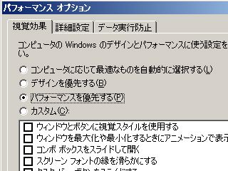 最後に、パフォーマンスの設定。コントロールパネルのシステムを開き、詳細設定にあるパフォーマンスを「パフォーマンスを優先する」に変更。これで、余計な視覚効果が外されて劇的に快適になった。