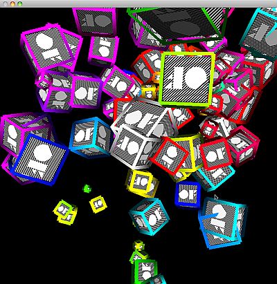 まだサンプルを動かして見ただけの感想だけど、これは可成り良いですね。書かなければ成らないソースコードも思ったよりも少なめで、作ろうと思ったモノが簡単に出来るのかもしれません。Flashでは力不足、QuartzComposerだと不得意な部分だったり複雑すぎて作るのが面倒、なんて場合には、openFrameworksの出番かも。