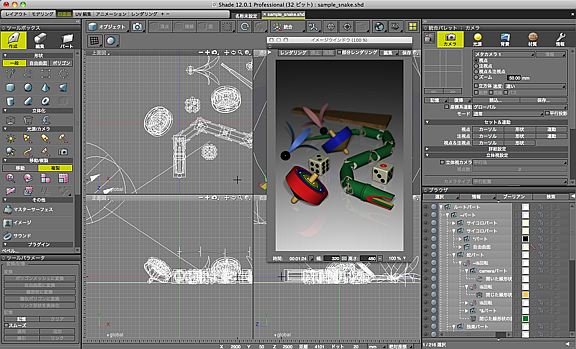 いやー、画面が全然違いますね。機能的には全く別物という感じではないので、メニューなどの使い方は、何となく分かりますが、今までと違って、ウインドウがひとまとめになって仕舞っているので、画面が小さいと作業が辛そう。先日公開されたXcode 4といい、Shade 12と、Windowsアプリみたいなウインドウになってますね。最近はAdobeもその傾向が有り、Macらしさが薄れてちょっと嫌だな。なれれば、悪くないのかもしれませんが・・・。