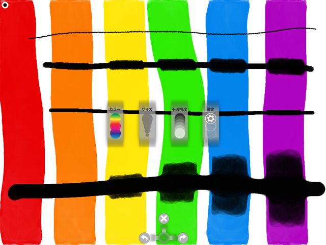 実際に使ってみた感想としては、面白いです。ただ、線の太さによって色が滲んだり、滲まなかったりするので、この辺の使い分けが上手くできないと難しそう。おそらく、先に背景となる部分を一気に太く塗っておき、手前の細かい線を後で書き込むってやり方がよいのかな。後で太い線を上から書くと滲んでしまって台無しに成増。特に注意が必要なのは取り消し操作が一度しかできない事。もう少し戻れると良いのですが、現時点では出来ない様です。勢い余って、沢山線を書いてしまうと最悪です。