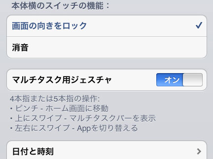 事前に発表時のビデオを見ていたので、直ぐに使い方が分かりましたが、実際に試してみてもちょっと馴れないインターフェイスです。それにiPadのマルチタスク用ジェスチャーをオンにしていると、誤動作する場合もあります。ジェスチャーが衝突しているわけではないのですが、指を置いただけのつもりが少し横に動いてしまうと画面が切り替わってしまったりします。馴れない場合は、マルチタスク用ジェスチャーを切っていた方が良さそうです。マルチタッチなジェスチャー以外にメニューを出す方法があれば良いんですけどね。