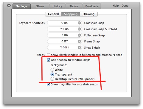 いつも、我慢してSnapz Pro Xを使ってましたが、Skitchの設定画面を見てみると、白、透過、デスクトップが選択出来るではないですか!素晴らしいです。
