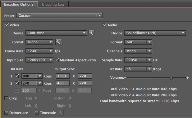 同様の解像度で高解像度版の配信をする場合、CamTwistは23fpsにすると良いらしい。何故23fpsなのかよく分かりませんが・・・。FMLEの出力も1280x720にして、フレームレートも合わせ、配信映像のビットレートは800kbpsくらいにすれば、まずまずの感じになります。FMLEだと結構綺麗に配信出来るので、Ustream ProducerのSDクオリティに比べれば雲泥の差。Ustream Producer Proを使えばもっとお手軽なんだろうけど、頻繁に使わない物にお金は出せませんからね。