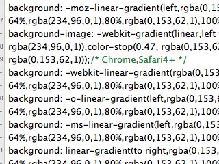 次に、グラデーションに角度が付いている場合の対応が不完全。一部、Chrome 9以前の記述の所だけ対応してます。0度以外の時に座標が入る様にしてますが、90度などは未対応。正しいかどうかも不明(笑)