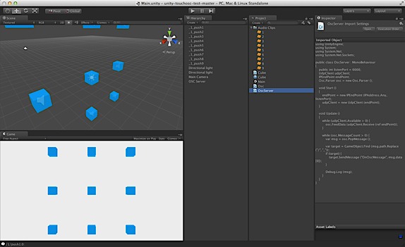 更に「LFO」をパッチに追加し、Input Parameters(Cmd + 1)で、TypeをSqureに変更。この「LFO」のResultを「OSC Sender」の/1/push1に接続する。以上で、すぐさま送信開始する。あとは、Unityでunity-touchosc-testを実行すれば、動作確認出来る。