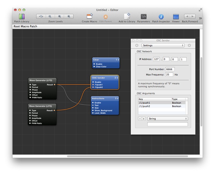 実際に動かすにあたり、何か送信する側が必要になるのだが、Quartz Composerがインストールされている場合は、Quartz Composerを使えば簡単に送信側が出来る。「OSC Sender」をパッチに追加して、Setting(Cmd + 2)でOSC NetworkのIP Addressを127.0.0.1、Portを6666とし、OSC Argumentsに/1/push1、/1/push2の様なKeyをType Booleanで追加する。