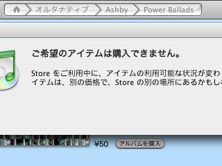 またまたiTMS(iTunes Music Store)で50円アルバムが大量に出たようです。残念ながら、今回は気付く前に販売終了となってしまったらしく、購入ボタンを押しても買えません。まぁ今回はあまりメジャーな物は無いようですし、興味の無さそうな物ばかりだった雰囲気なので、買える状態になっていたとしても買わなかったかも。iPod同期用のiBookのHDDも容量が残り少ないですし・・・。
