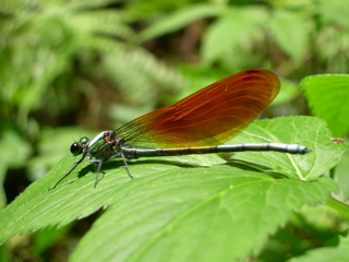 実は、トンボはもう一種類居たのですが、撮影できませんでした。撮影できたのは茶色の羽ですが、撮影できなかった方は綺麗な青い羽でした。山の奥へ入ると土砂崩れになっているところがあり、その近辺の沢に茶色の羽のトンボが沢山居ました。